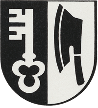 Schlüssel und Zimmermannsbeil verweisen auf die Kirchenpatrone von St. Peter in Mistail und St. Joseph in Alvaschein.