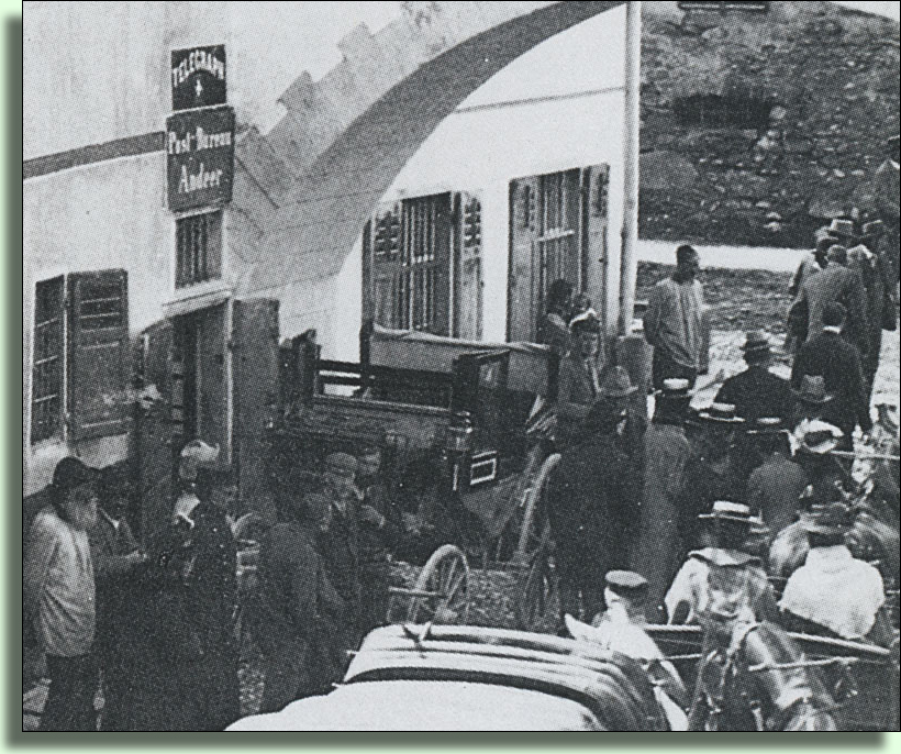 (Das Postauto links hat auf der linken Heckseite einen Holzgas-Generator eingebaut, welcher Holzkohle in Gas umwandelte.)