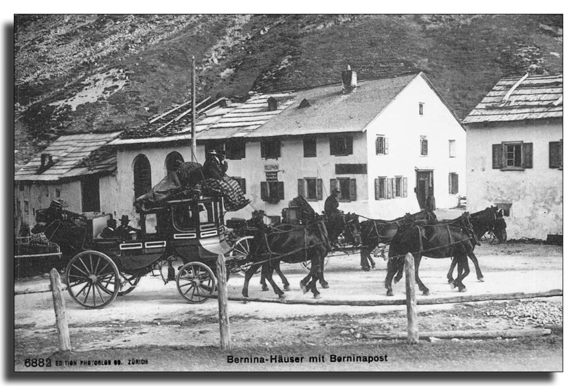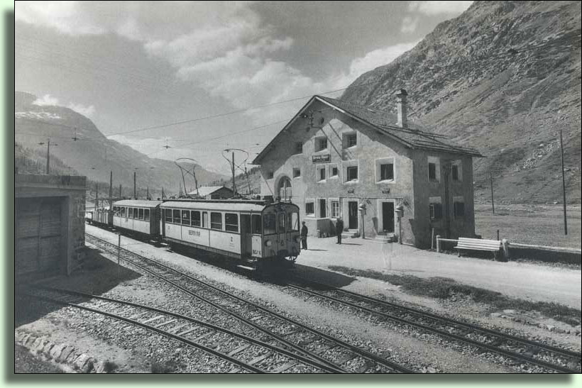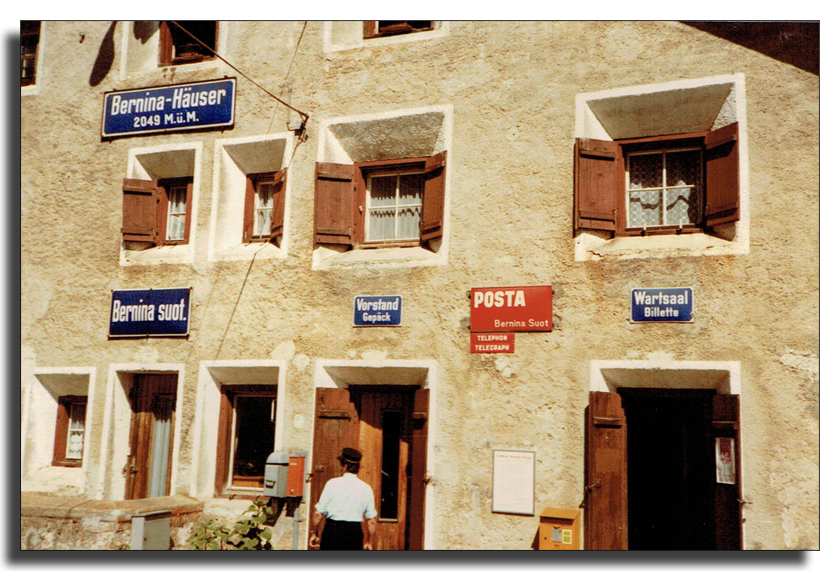 Schönes Dokument aus der Zeit wo die gute alte PTT bemüht war, mit vielen Poststellen dem Volk nahe zu sein. So auch in diversen Bahnhöfen der RhB, diese Postbüros wurden vom Stationshalter der RhB geführt und brachten ihm dadurch eine besser Auslastung des Arbeitspensums. Bernina Suot, das kleine Bahnhöfchen direkt an der Strasse, wo der Stations- und Posthalter bei jedem Zug den Verkehr aufhalten musste, um die Passagiere gefahrlos ein- und aussteigen zu lassen. Hier hat er soeben den Abfahrbefehl für den Zug gegeben und wendet sich wieder seinen Büros zu. Das Foto ist ein Schnappschuss aus dem Zugsfenster und ist dadurch ein wunderbares Zeitdokument worden. Als ich von der Schliessung dieser Post vernahm, erinnerte ich mich sofort an dieses Foto und ich wusste sogleich, dass ich da irgend etwas basteln muss für den Letzttag der Post. Das Resultat ist hier abgebildet und ist der Beginn einer schon fast 40-jährigen Dokumentation aller zu schliessenden Postbüros.