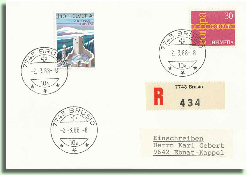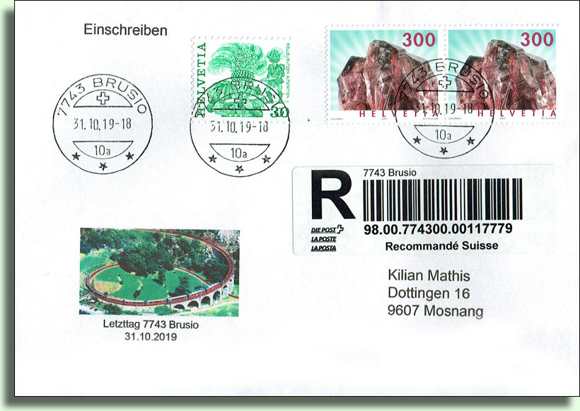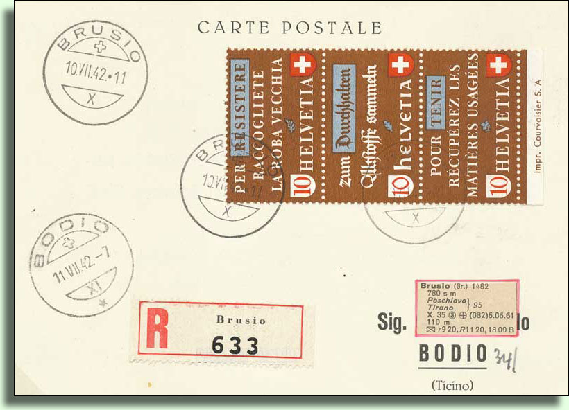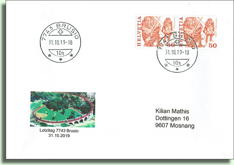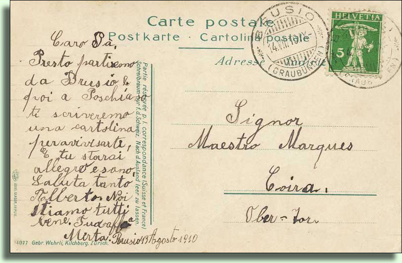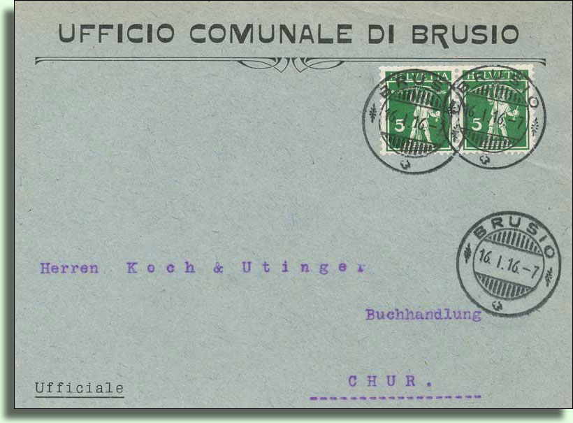 Bekanntlich merkte die Post im Herbst 1912, dass deutsche Kantonsangaben bei Stempeln im italienischen Sprachgebiet des Kantons Graubünden falsch seien. (Graubünden) wurd entfernt und durch das Kreuz ersetzt. Bei Brusio wurde anscheinend das Kreuz vergessen (siehe oben) und erst später eingesetzt (siehe unten).