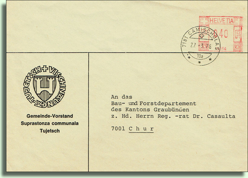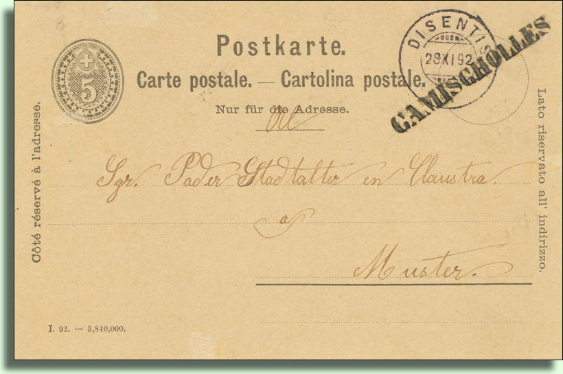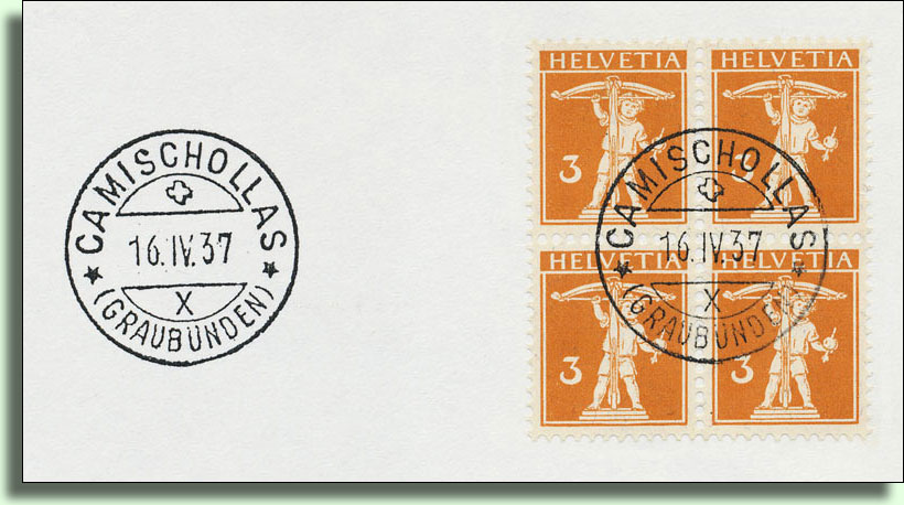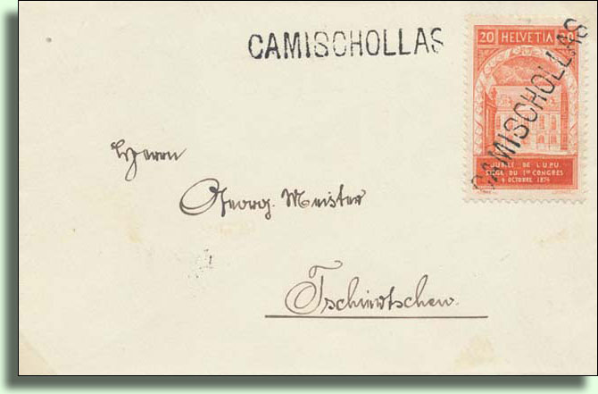 Camischolas: …1424 m, Weiler an der Oberalpstrasse, Postablage, 16 Häuser, 85 katholische Einwohner romanischer Zunge, 1822 gänzlich durch Feuer zerstört.
