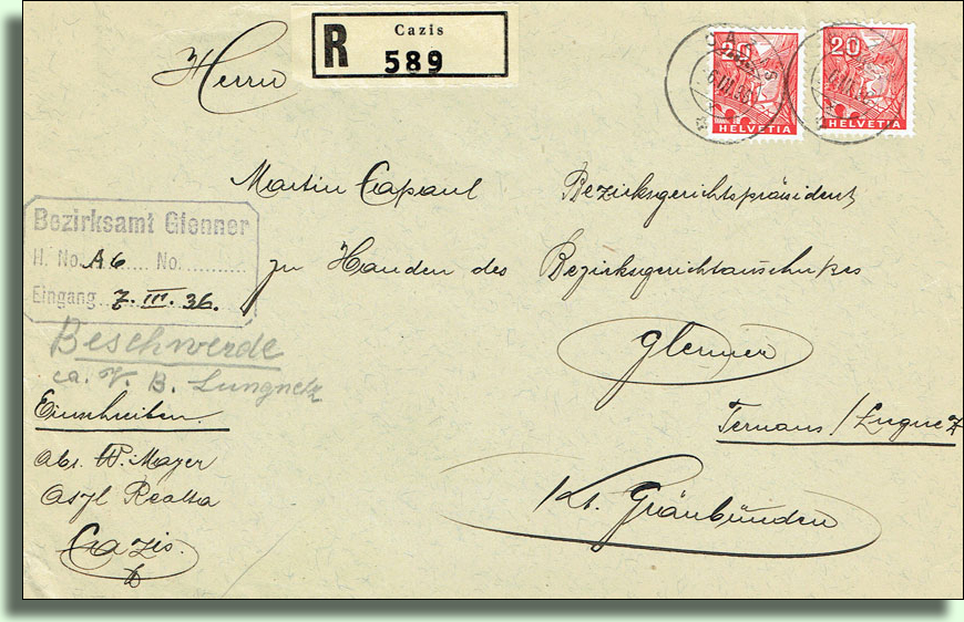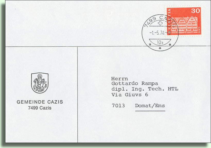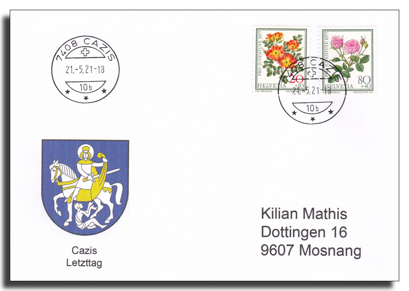 Das Wappen zeigt den St. Martin auf dem Pferd, der seinen goldigen Mantel mit einem Bettler teilt. Der St. Martin auf dem Caznerwappen ist der Schutzpatron von Cazis und ist schon im Gemeindesiegel überliefert, weil der Patron von der alten Pfarrkirche St. Martin im Volksbewusstsein tief verwurzelt gewesen ist.
